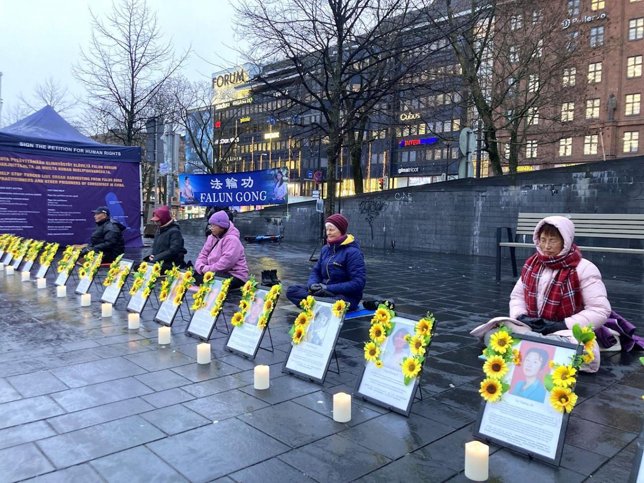 Kylmästä säästä huolimatta lauantaina 15. marraskuuta 2025 suomalaiset Falun Gongin harjoittajat järjestivät tavalliseen tapaan mielenilmauksen Helsingin Kampissa. -